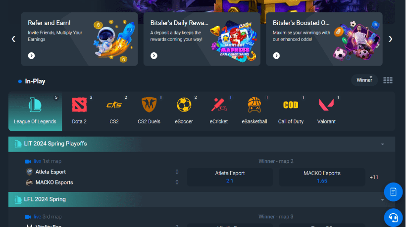 Bitsler is not only a casino; it also has a sizable sports area where you can wager on current and future events across a wide range of major sports. Some examples of these are motorsports, hockey, golf, rugby, tennis, cycling, boxing, mixed martial arts, and a host of others. Several well-known eSports titles are also available, such as FIFA, League of Legends, Dota2, and Counter-Strike: Global Offensive.