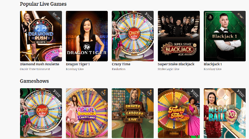 Game shows including Deal or No Deal, Crazy Time, Dream Catcher, Monopoly Big Baller, and many more are available for wagering. Play minigames like Mini Roulette, Plinko, Dice, or Goal in addition to all this.